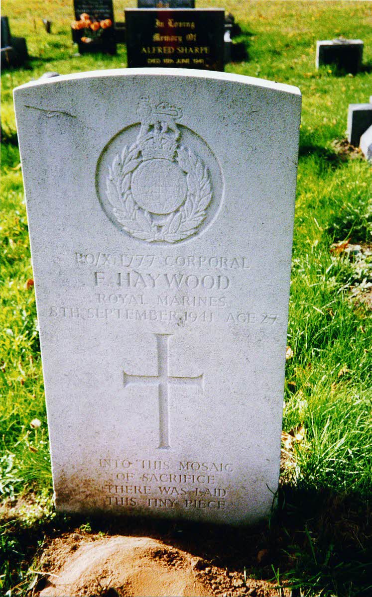 Corporal Haywood was serving in Portsmouth Division when he died Inscription: Into this mosaic of sacrifice there was laid this tiny piece