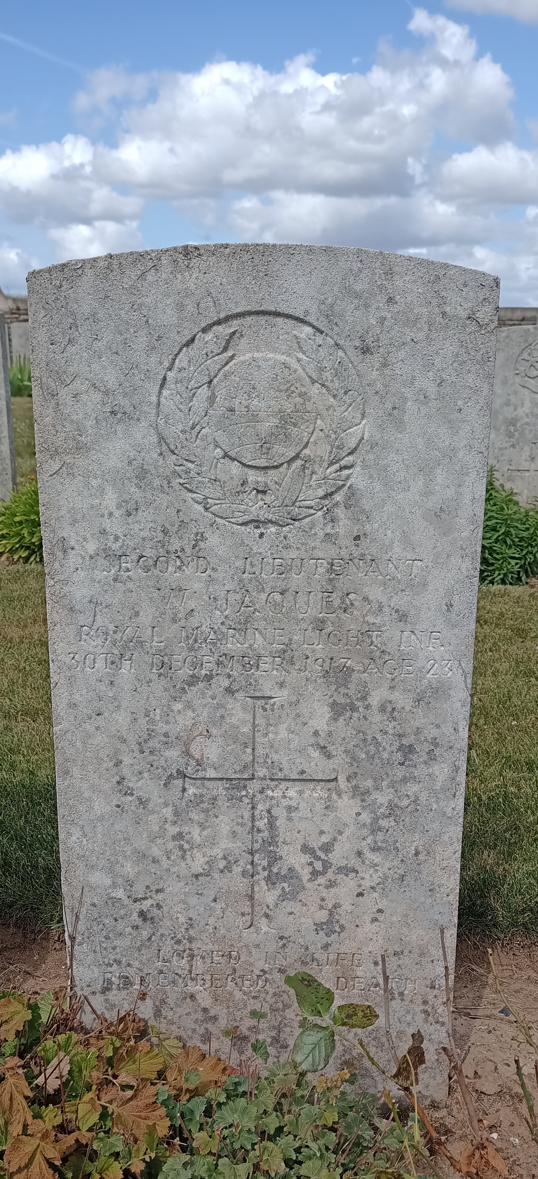 Son of Mr. and Mrs. J. Jaques; husband of Nellie Jaques, of 22, Altar View, Crossflatts, Bingley, Yorks. Native of Bingley.