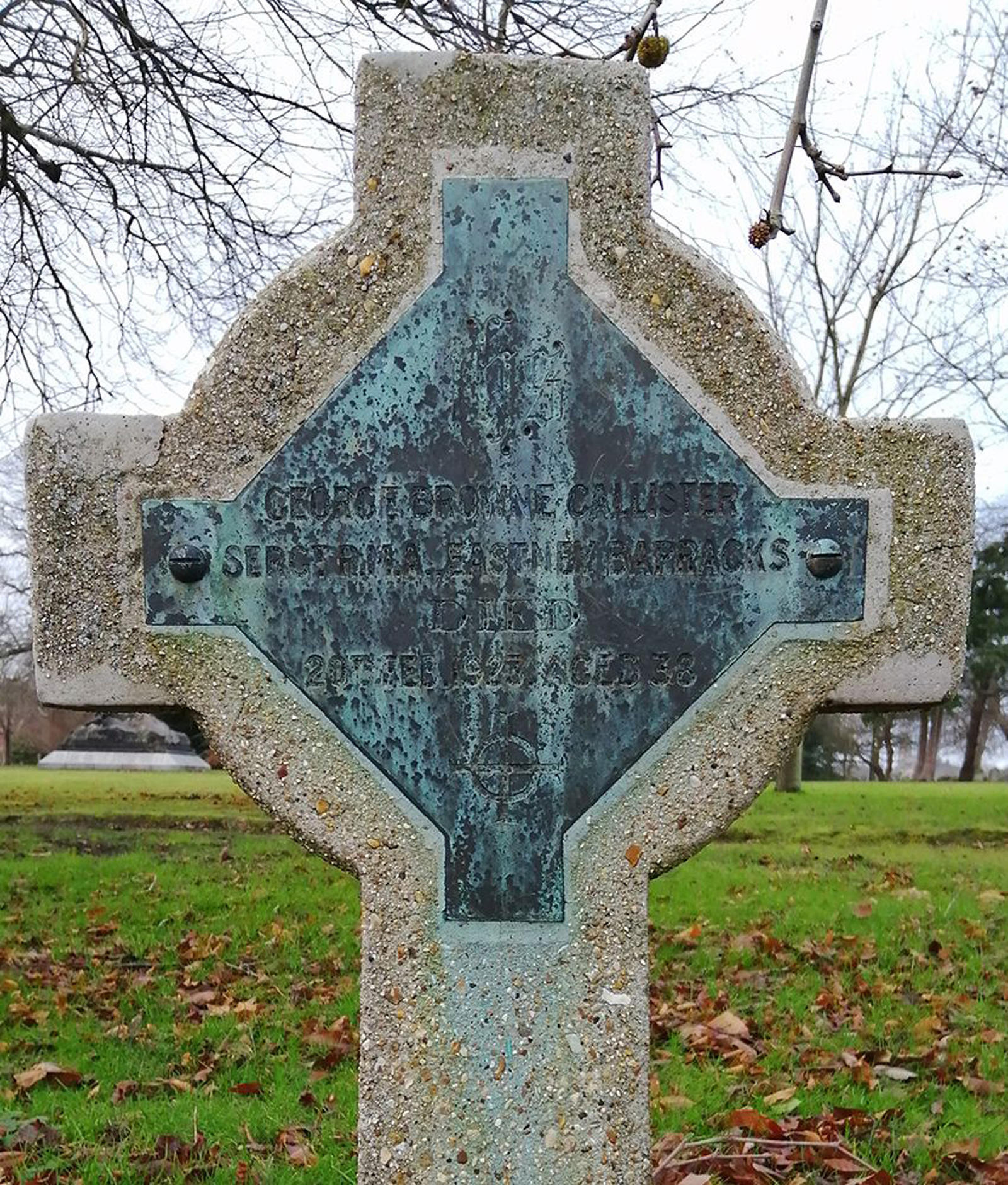 Burial location: Plot E 44 1. Inscription: George Browne Callister, Sergt RMA, Eastney Barracks. Died, 20th Feb 1923. Aged 38