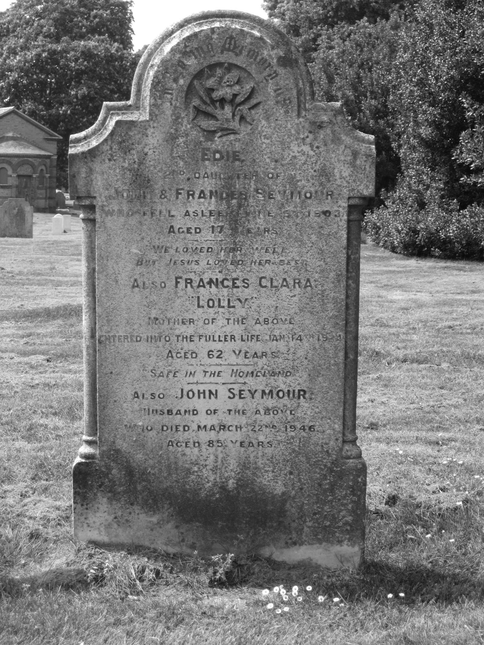 Burial location: Plot Q, North Wall,Row 1, Grave 13. Inscription: In loving memory of, Edie, 2nd daughter of John & Frances Seymour who fell asleep June 5th 1903, Aged 17 years. "We loved her well, But Jesus loved her best". Also Frances Clara "Lolly", Mother of the above, Entered into the fuller life Jan 14th 1924, Aged 62 years. "Safe in the Homeland". Also John Seymour, Husband of the above, who died March 22nd 1946, Aged 85 years.