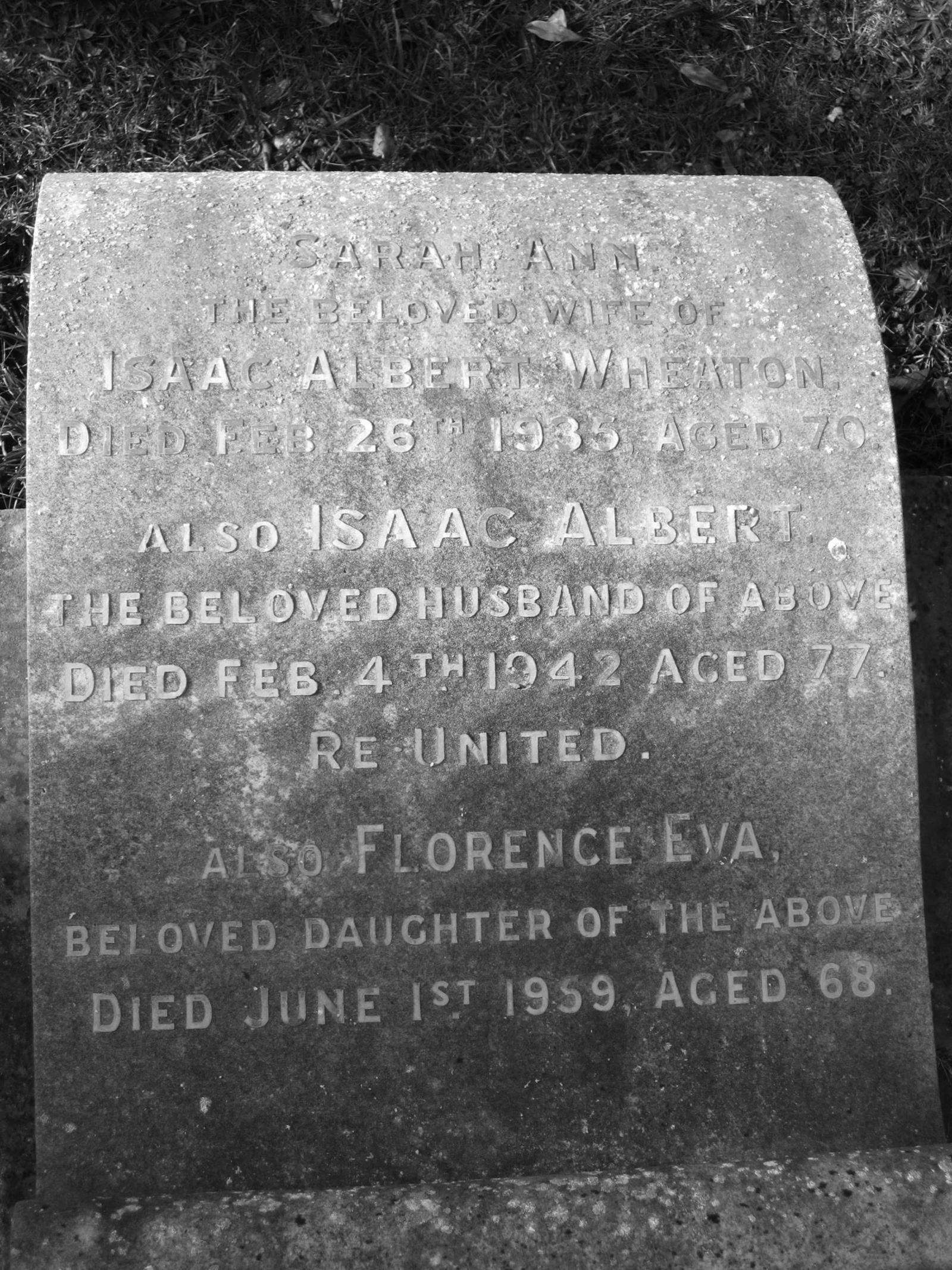 Inscription: Sarah Ann the beloved wife of Isaac Albert Wheaton, Died Feb 26th 1935, Aged 70. Also, Isaac Albert Wheaton the beloved husband of above, Died Feb 4th 1942, Aged 77. Re-united. Also Florence Eva, beloved daughter of the above, Died June 1st 1959, Aged 68