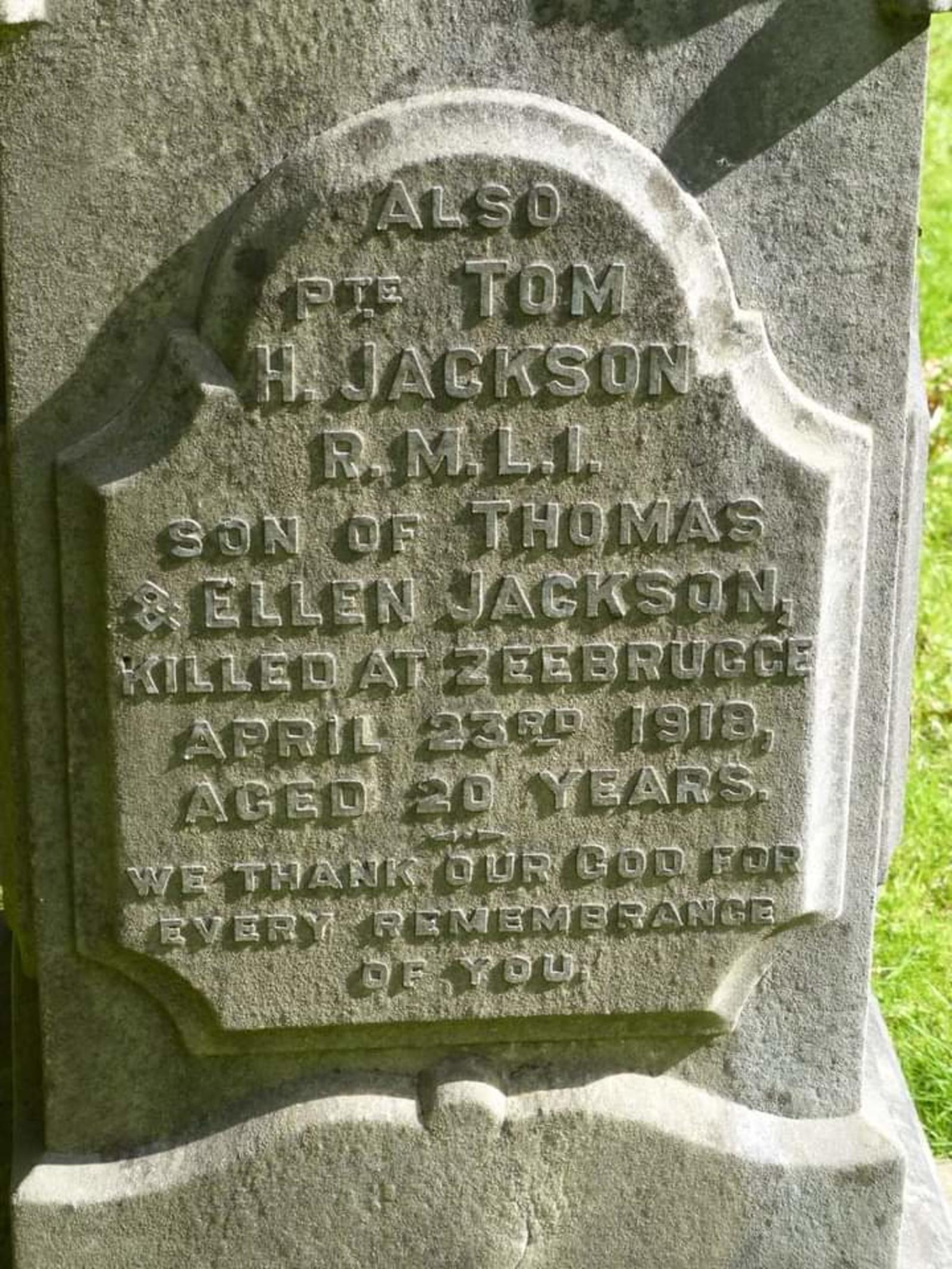 Died of wounds at Zeebrugge. Son of Thomas & Ellen Jackson