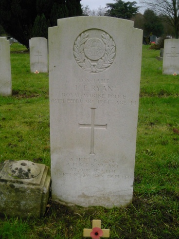 Son of William T Ryan and Laura Ryan, of 19, Mayville Road, Low Leyton, West Ham, Essex, their fourth child. Born 16 September 1899. Leonard's civilian occupation 1939 Register; Carpenter. Residing at 24 Hermitage Lane, Aylesford, Ditton, Malling, Kent with wife, Annie D Ryan (b. 20 July 1907 - d. 1947) and their two children