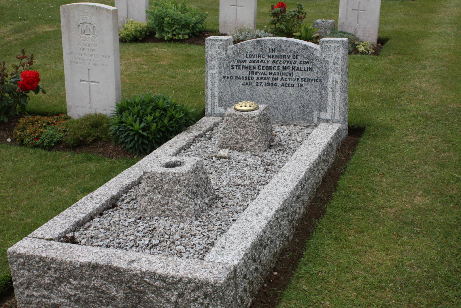 Inscription: In loving memory of ------------ beloved son Stephen George McKallin ( Royal Marines ) who passed away on active service 27 Jan. 1944 aged 19.