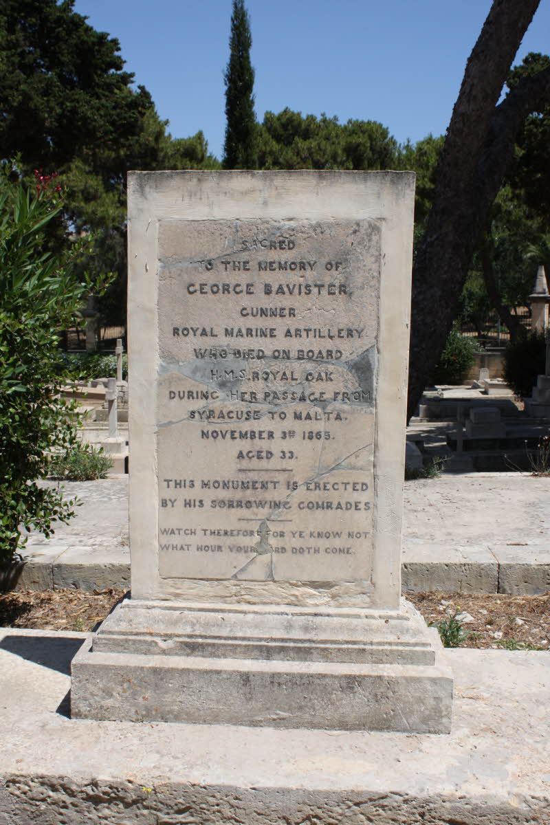 The grave was damaged during the Second World War. Inscription: Sacred to the memory of George Bavister, Gunner, who died on board HMS 'Royal Oak', during her passage from Syracuse to Malta. This monument is erected by his sorrowing comrades.