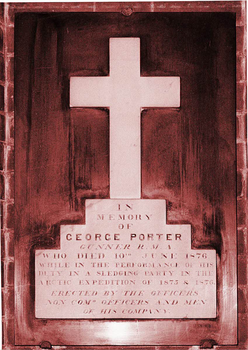 Gunner Porter held the Naval Long Service Medal and Good Conduct Medal, and the Arctic Medal. The Royal Marine Museum Archive has a small painting, by a Surgeon Moss, of Gunner Porter's Arctic burial site. ( Ref Acq. 56/78 ). Inscription: - formerly located St. Andrew's Church, Henderson Road, Eastney, Southsea.