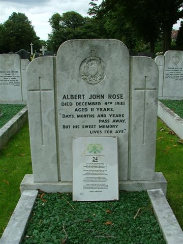 After Dark on the evening of 4 december, 1951, a bus ran into a marching group of Royal Marines Cadets, of whom 24 died. 22 are buried in Gillingham New Cemetery ( Naval & Military Section ), including 3 in its Roman Catholic enclave. Inscription: Days, months, and years pass away, but his sweet memory lives for aye