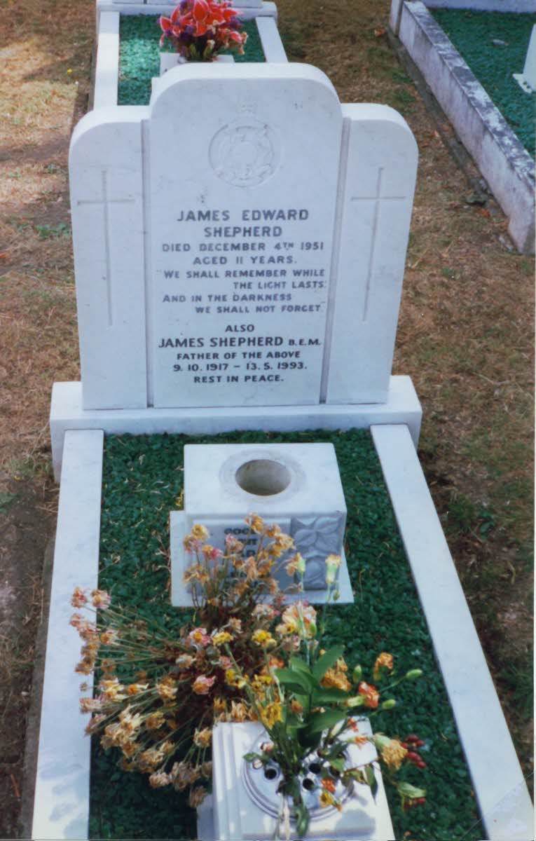 After Dark on the evening of 4 december, 1951, a bus ran into a marching group of Royal Marines Cadets, of whom 24 died. 22 are buried in Gillingham New Cemetery ( Naval & Military Section ), including 3 in its Roman Catholic enclave. Inscription: We shall remember while the light lasts, and in the darkness we shall not forget