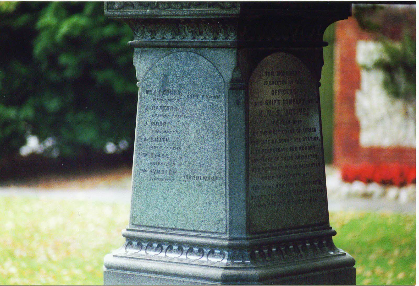 Died Fort Exowe? Inscription: This monument was erected by the Officers and Ship's Company of HMS 'Active' late Flag ship on the West Coast of Africa to perpetuate the memory of those of their shipmates who perished while gallantly doing their duty with the Naval Brigade of that ship.