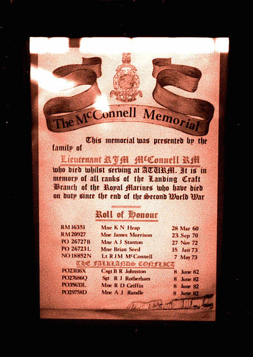 Plaque located at the Landing Craft Branch Museum, RM, Poole, Hamworthy, Dorset Inscription: his Memorial was presented by the family of Lt. R. J. McConnell, RM, who died whilst serving at ATURM. It is in memory of all ranks of the Landing Craft Branch of the Royal Marines who have died on duty since the end of the Second World War.