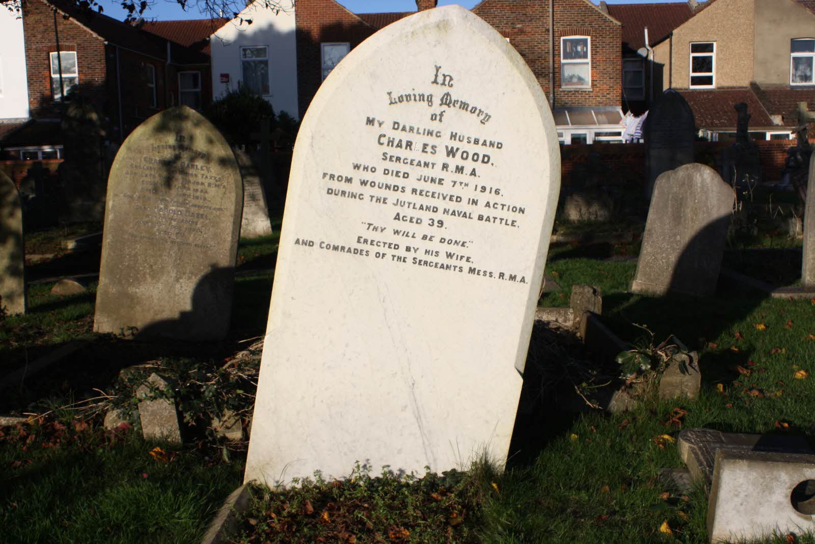 Erected by his wife and comrades of Sergeants Mess Royal Marine Artillery. Sergeant Wood died from wounds received during Battle of Jutland, 1916. Inscription: Thy will be done.