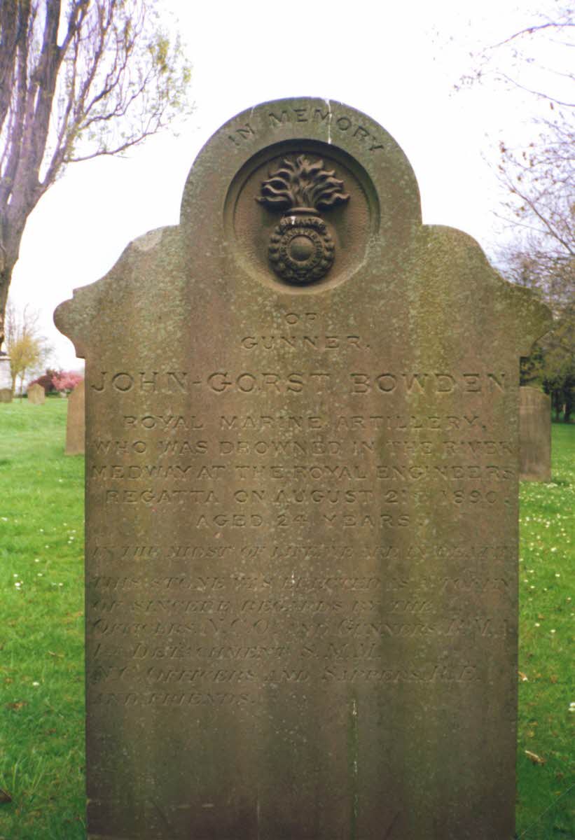 J G Bowden, born 1866, Liverpool. Trade - engine cleaner, enlisted 1887, served Eastney, joined Chatham July6 1889. Inscription: Gunner Bowden Royal Marine Artillery was drowned in the River Medway at the Royal Engineers Regatta, 21 August, 1890. In the midst of Life we are in Death. Stone erected by Officers, NCO's, Gunners Royal Marine Artillery,NCO's, Sappers, RE and Friends.