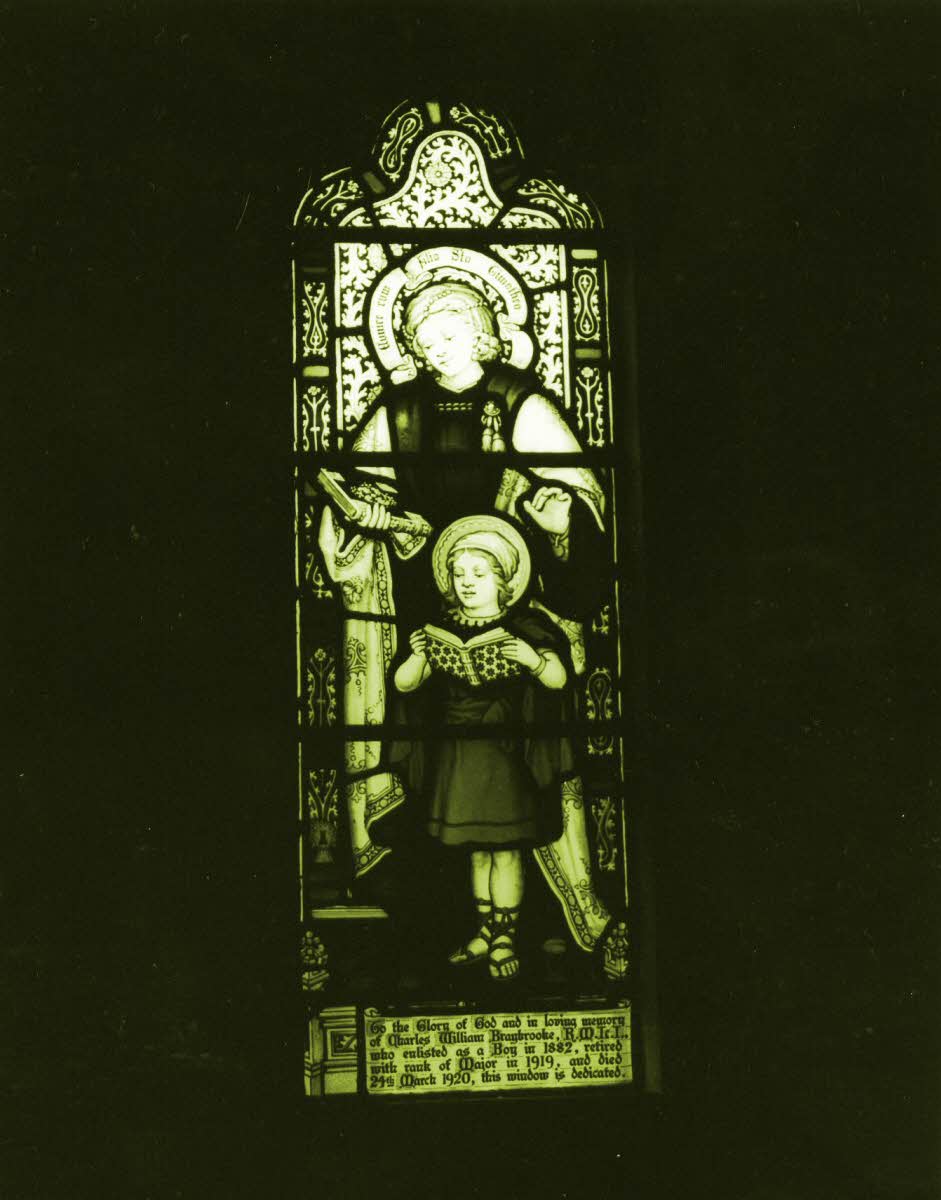 Located St. Michael and All Angels Church, the Royal Marines School of Music, Deal, Kent Inscription: To the Glory of God and in loving memory of Charles William Braybrooke, Royal Marine Light Infantry who enlisted as a Boy in 1882, retired with the rank of Major in 1919, and died 24 March, 1920, this window is dedicated.