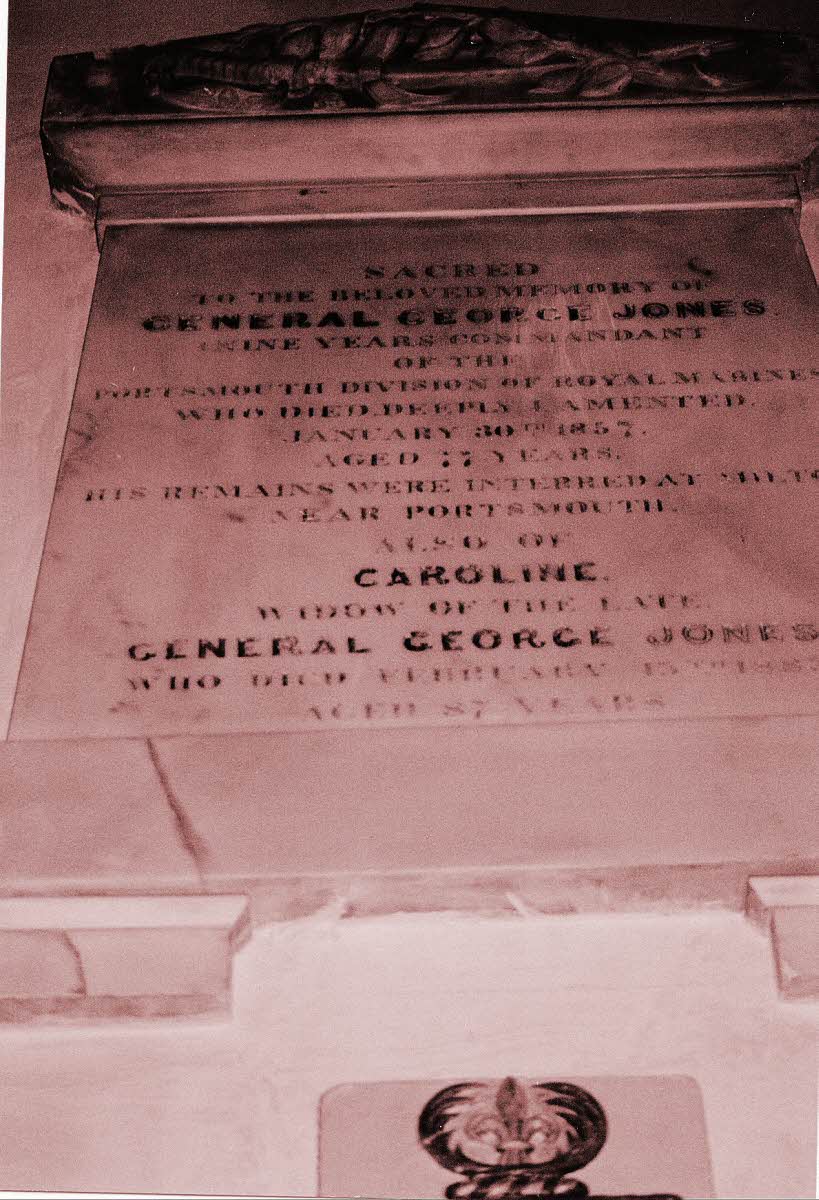 Plaque in Portsmouth Cathedral, Old Portsmouth, Hampshire Inscription: Sacred to the beloved memory of General George Jones, nine years Commandant of the Portsmouth Division of Royal Marines who died deeply lamented January 30th 1857 aged 77 years.