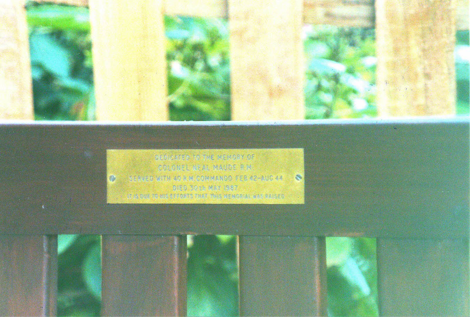 Located Shanklin, Chine, Isle of Wight. Plaque is on wooden bench seat to left of 40 Royal Marines Commando Memorial. Inscription: Dedicated to the memory of Colonel Neal Maude RM, served with 40 RM Commando Feb 42 - Aug 44. Died 30 May, 1987. It is due to his efforts that this memorial was raised.