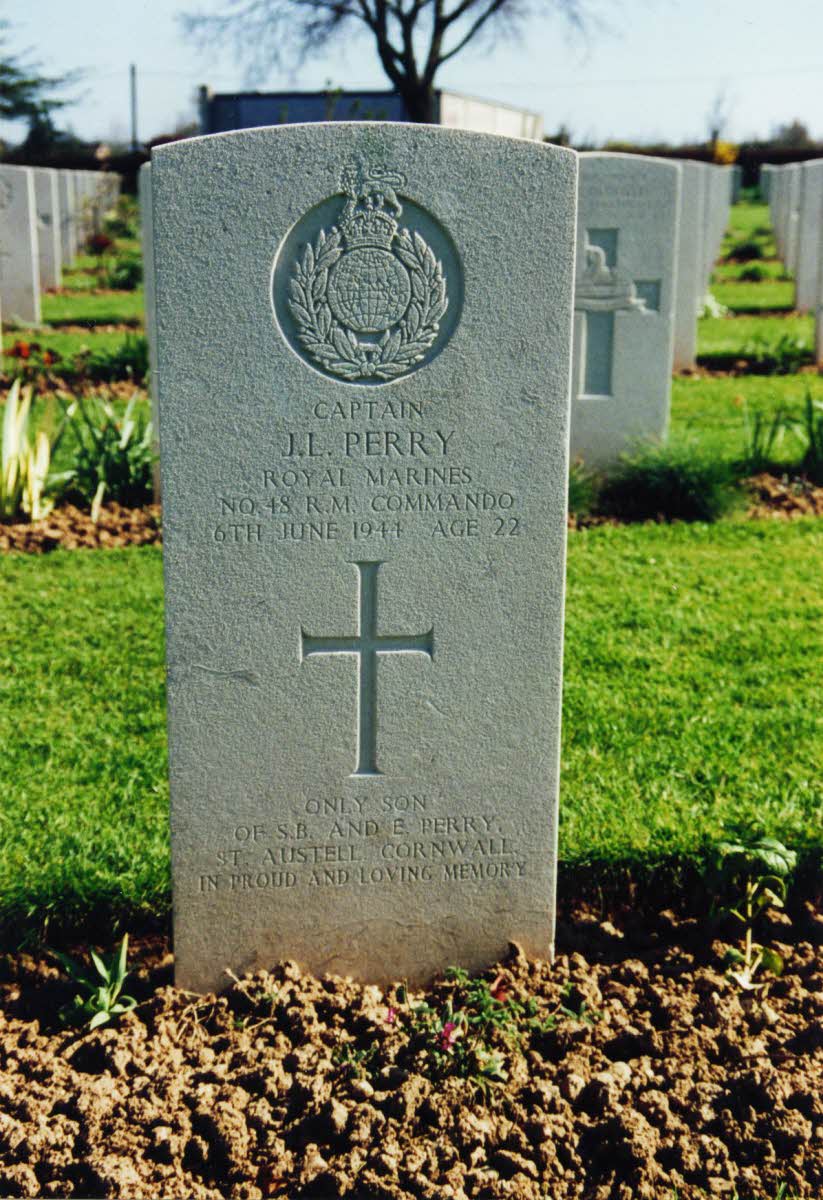 Inscription: Rue du Capitaine Perry, named after Captain J. L. Perry, RM, killed during attempt to capture 48 RM Commando D-Day objective the strong point on Langrune-sur-Mer seafront Only son of S. B. and E. Perry, St. Austell, Cornwall, in proud and loving memory