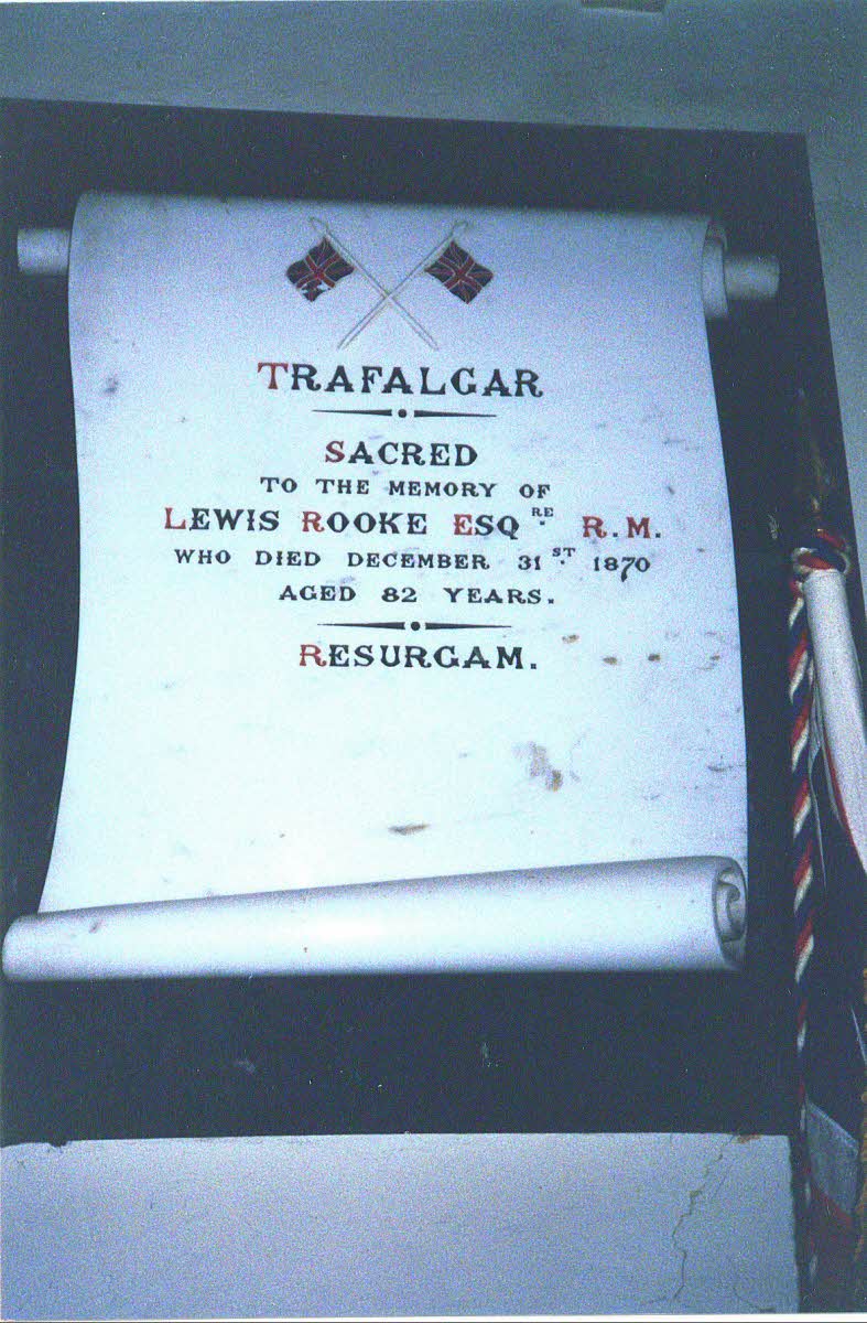 Lewis Rooke was a First Lieutenant, Royal Marines in the Second Battalion during the war with the United States of America 1812-1815. He seved on HMS 'Neptune' as a Second Lieutenant, Royal Marines at Trafalgar. Inscription: ( St. John The Baptist Church, Bishops Taunton, Devon )