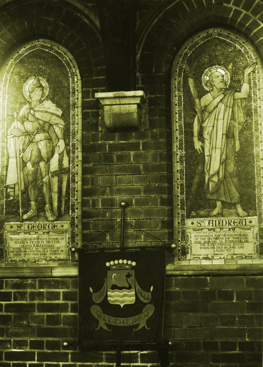 St. Andrew - Retiring in 1912 he volunteered at the outbreak of war and was serving in command of the Royal Marine Artillery Brigade depot when he died 19 June, 1916. Aged 57. ( Formerly located St. Andrew's Church, Henderson Road, Eastney, Southsea, Hampshire. ) Inscription: Stained Glass Windows: St. George - To the Glory of God in the memory of Warren Francis Trotter Colonel Royal Marine Artilleryrtillery These panels were erected by his brother officers as a token of their affection and esteem.