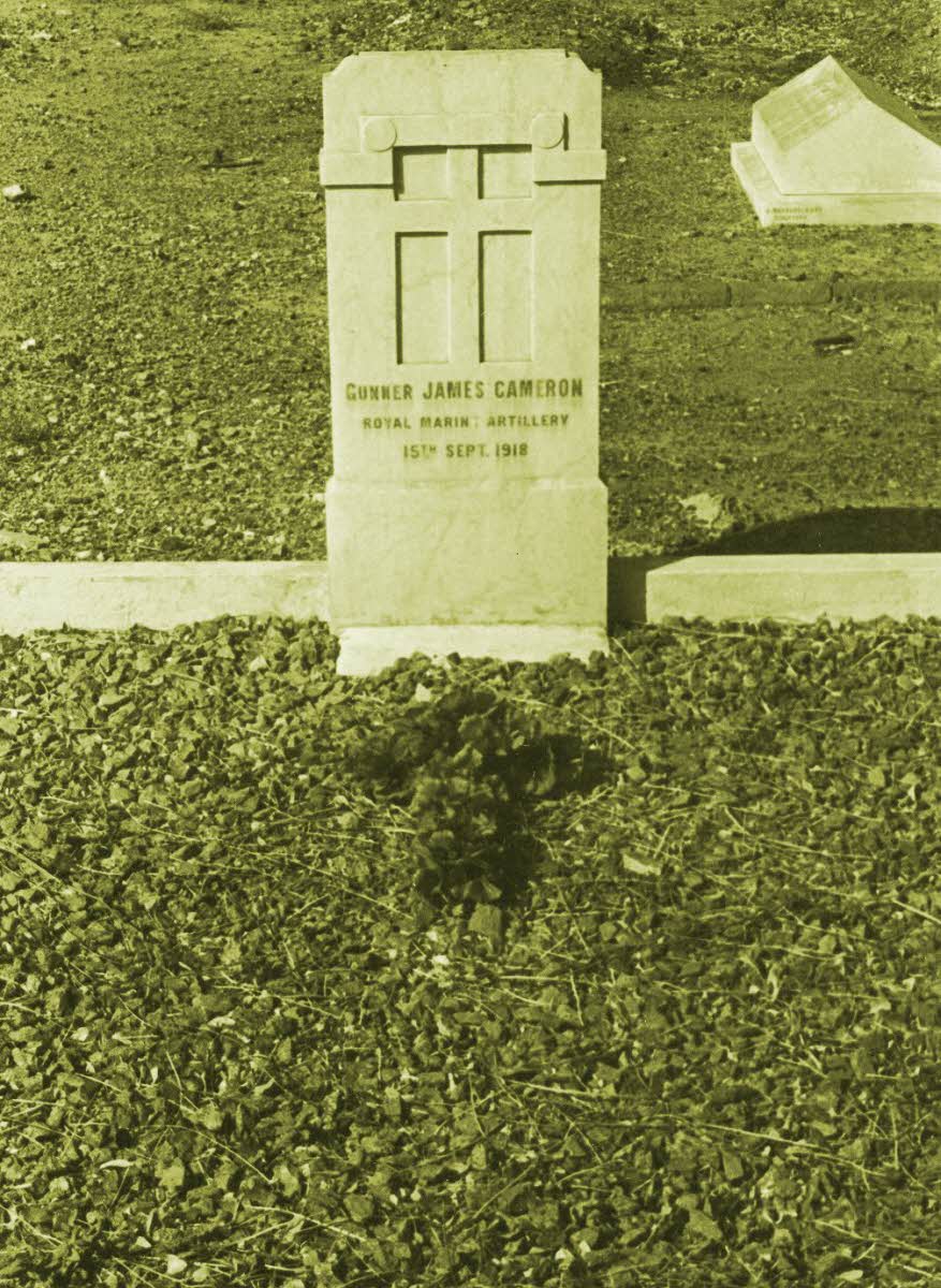 Gunner Cameron, Royal Marine Artillery, was serving aboard the armed merchantman SS City of Chester when he died. ( His Christian names were John, Ingram ).