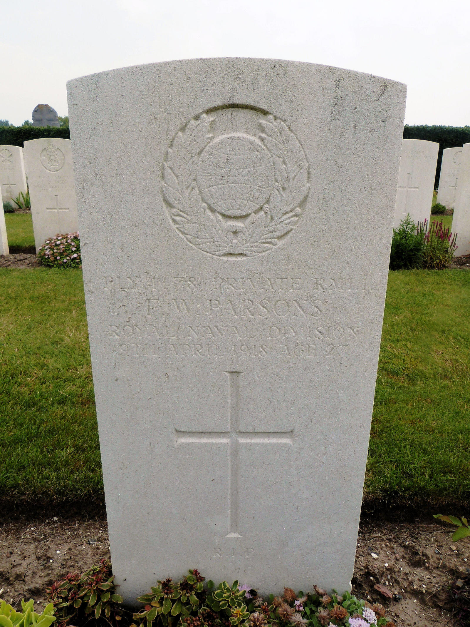 Son of W. J. and A. Parsons; husband of Annie Parsons, of Langley Cross, Wiveliscombe, Somerset. Born at Newton Abbot, Devon.