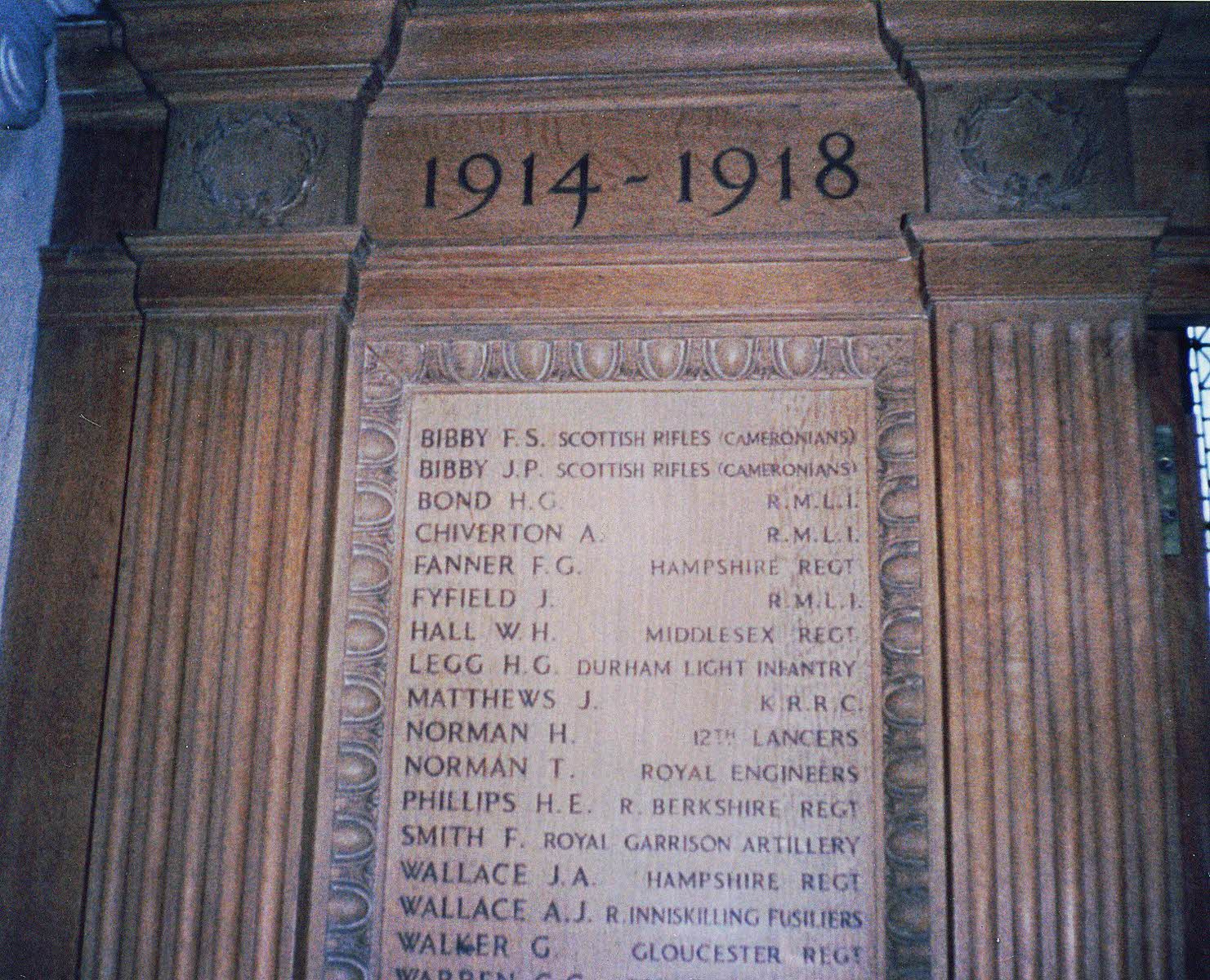 Name inscribed on 1914-1918 War Memorial Plaque Selborne Church, near Alton, Hampshire.