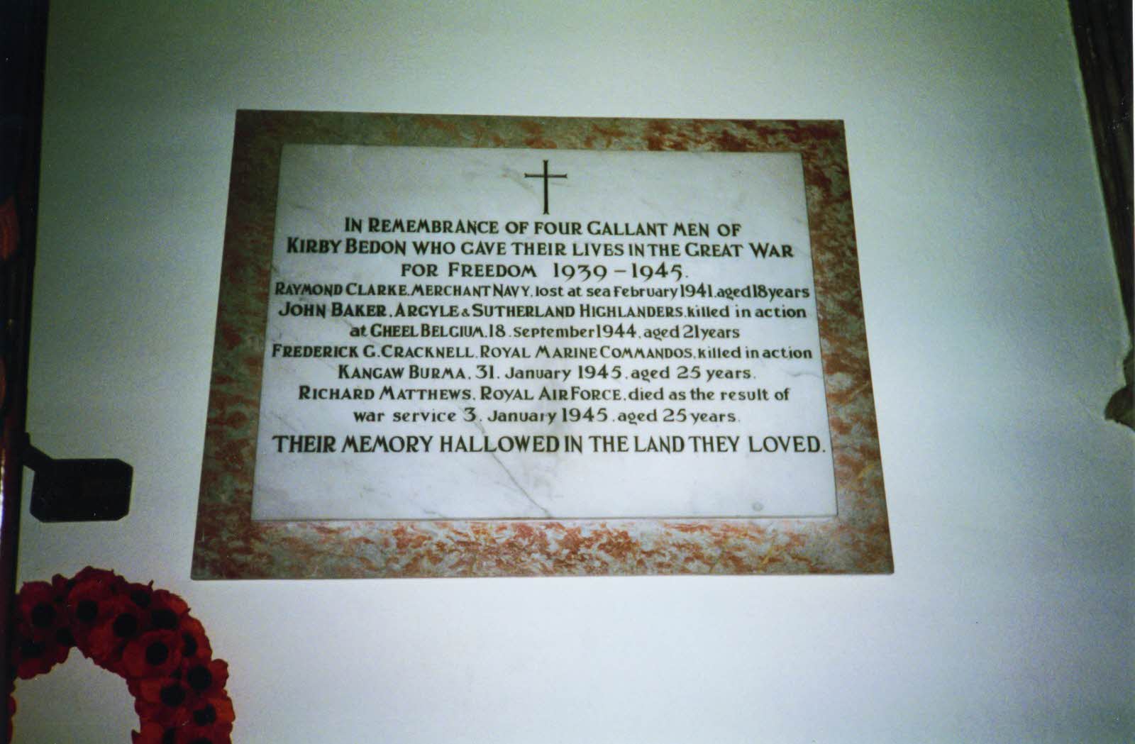 Memorial Plaque at Kirby Bedon, near Norwich, Norfolk. Inscription: Frederick G. Cracknell, Royal Marine Commando, killed in action Kangaw Burma, 31 January 1945 aged 25 years.