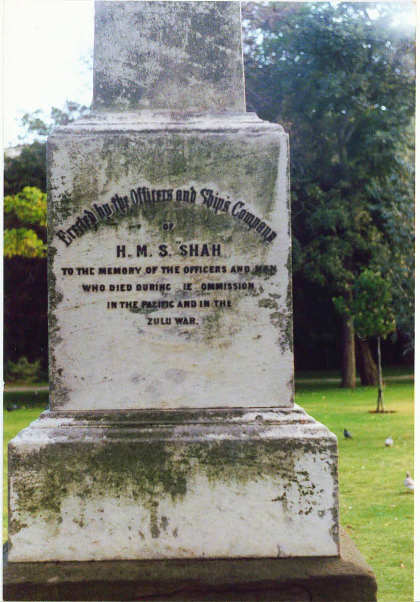 Inscription: Erected by the Officers and Men of HMS 'Shah' to the memory of the Officers and Men who died during the commission in the Pacific and in the Zulu War.