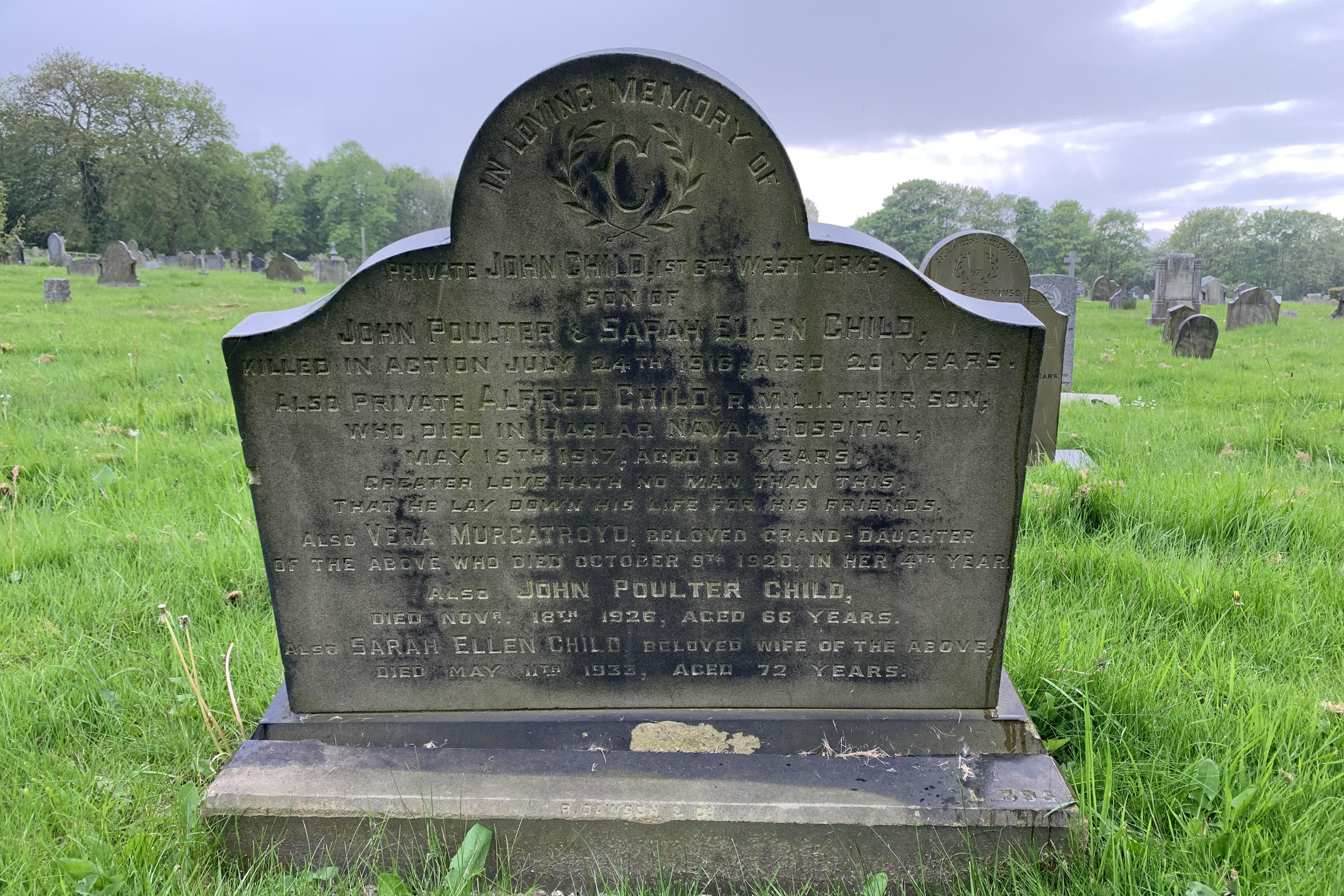 Son of John Poulter Child and Sarah Ellen Child, of 17, Talbot St., Legrams Lane, Bradford.