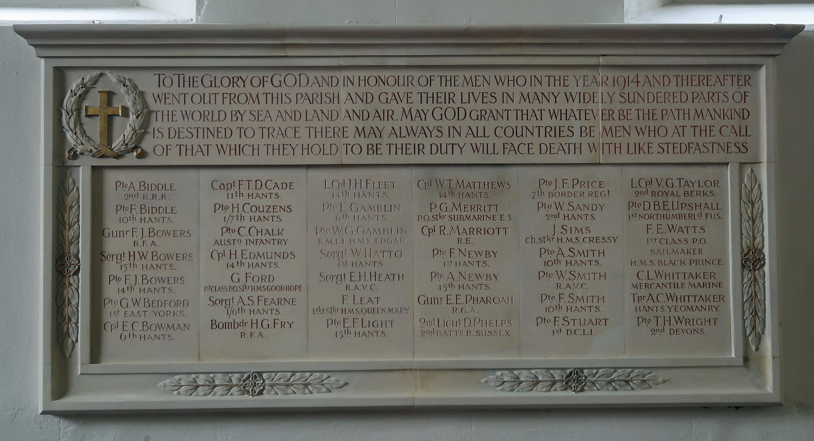 To the Glory of God and in honour of the men who in the year 1914 and threafter went out from this parish and gave their lives in many widely sundered parts of the World by sea and land and air. May God grant that whatever be the path mankind is destined to trace there may always in all countries be men who at the call of that which they hold to be their duty will face death with like steadfastness. Includes: Pte W G Gamblin, RMLI, HMS Edgar