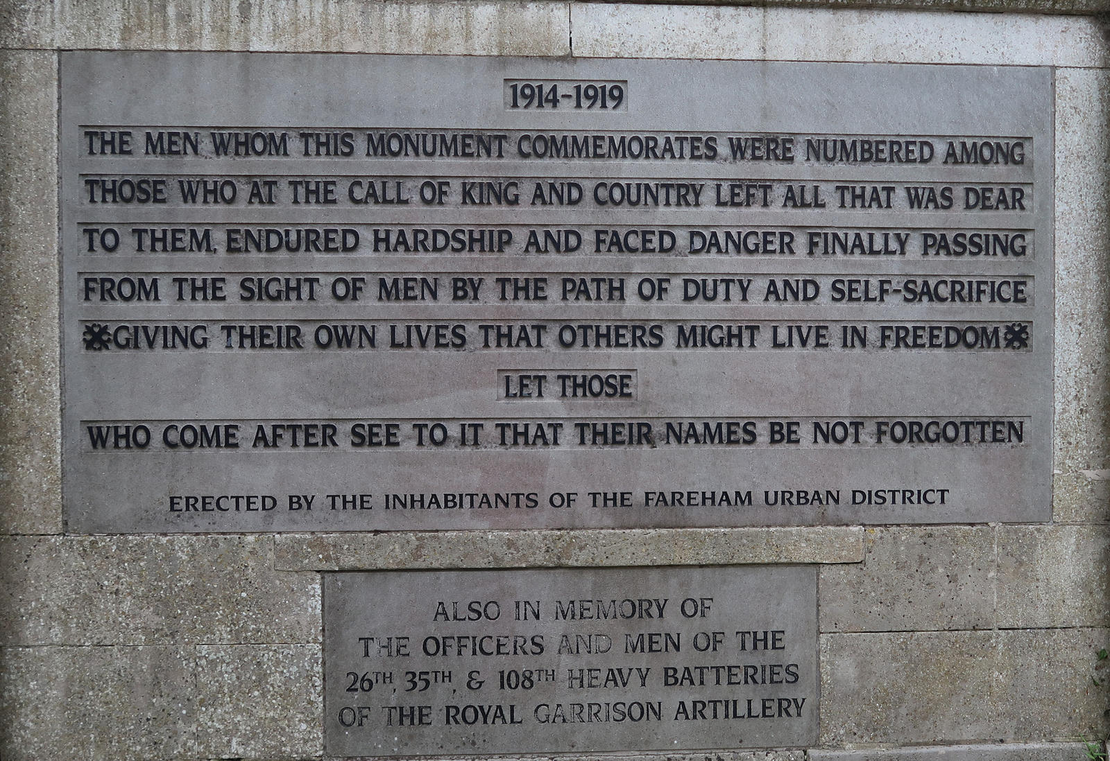1914-1919 - The men whom this monument commemorates were numbered among those who at the call of King and Country left all that was dear to them, endured hardship and faced danger finally passing from the sight of men by the path of duty and self-sacrifice *Giving their own lives that others might live in freedom* Let those who come after see to it that their names be not forgotten. Erected by the inhabitants of the Fareham Urban District Council. Also in memory of those who gave their lives 1939-1945