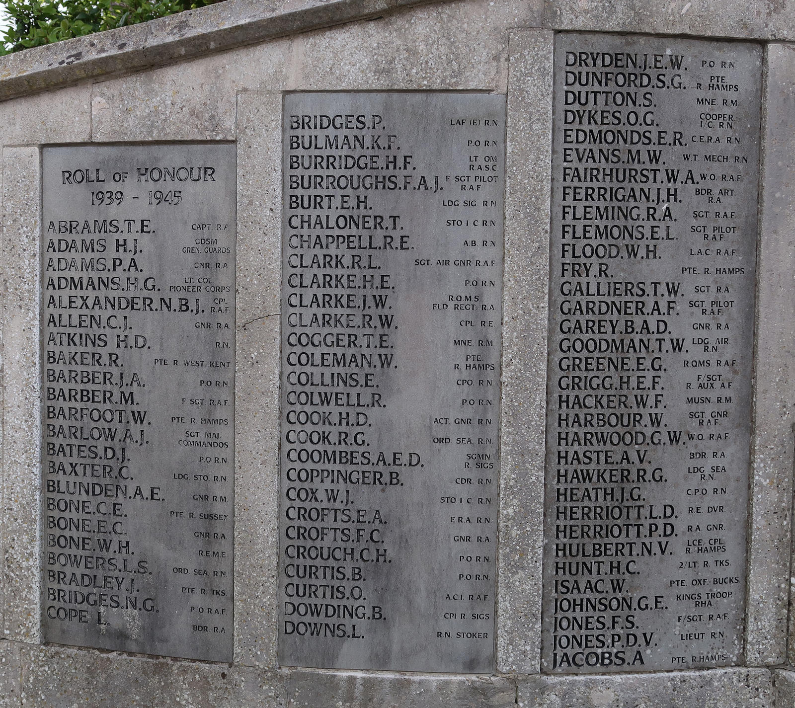 Mne Arthur Edwin Blunden, RM, EX/5155; Mne Thomas Edward Cogger, RM, PO/21115; Mne Stanley Dutton, RM, PO/X 628; Musician William Frank Hacker, RM Band, RMB/X 831. See Fareham High Street Memorial for overall view.