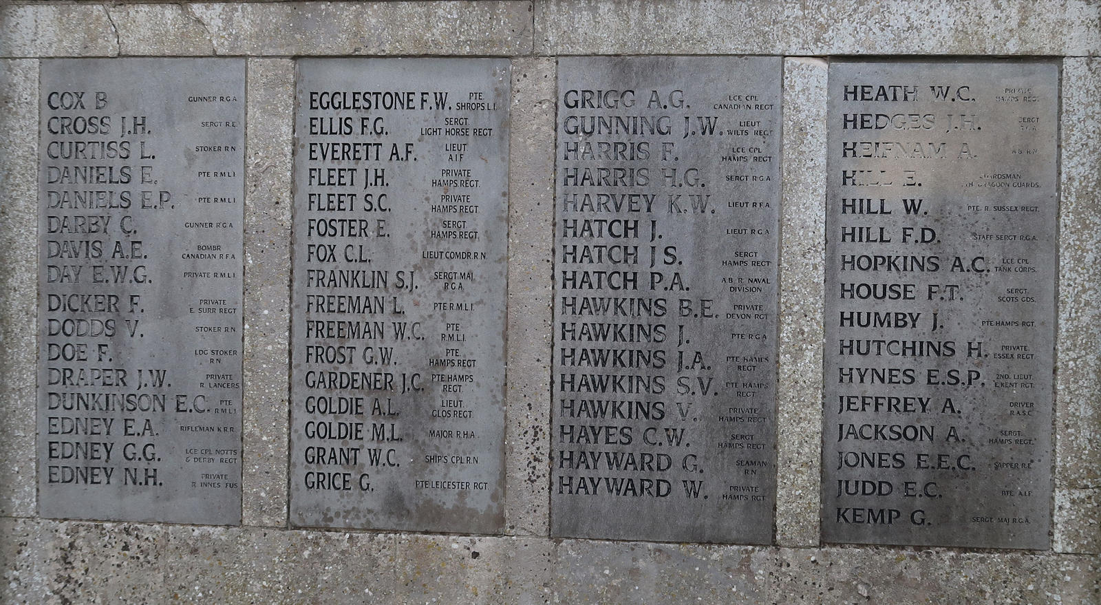 Pte Ernest Percy Daniels, RMLI, PO/14410; Pte Ernest William George Day, RMLI, PO/6628 (RMR/B/853); Lance Cpl Ernest Christopher Dunkinson, RMLI, PO/12424 (RMR/B/1101); Pte Leonard Freeman, RMLI, PO/16032; Pte William Charles Freeman, RMLI, PO/16779. See Fareham High Street Memorial for overall view.