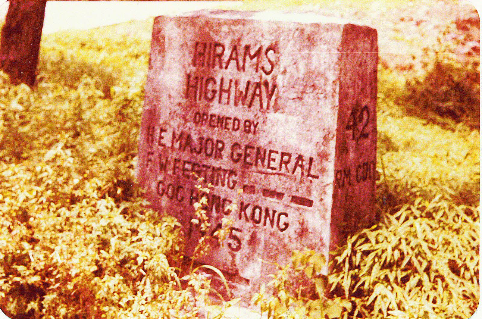 Location: Sai Kung Road to Clearwater Bay Road, Hebe Haven, Hong Kong. Inscription: Hirams Highway opened by H. E. Major General F. W. Festing, GOC Hong Kong, 1945.