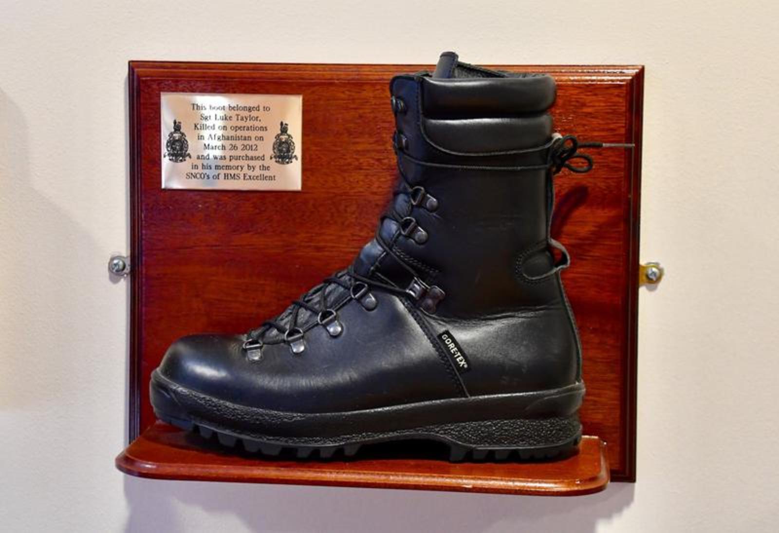 This boot belonged to Sgt Luke Taylor, Killed on Operations in Afganistan on March 26 2012 and was purchased in his memory by the SNCOs of HMS Excellent