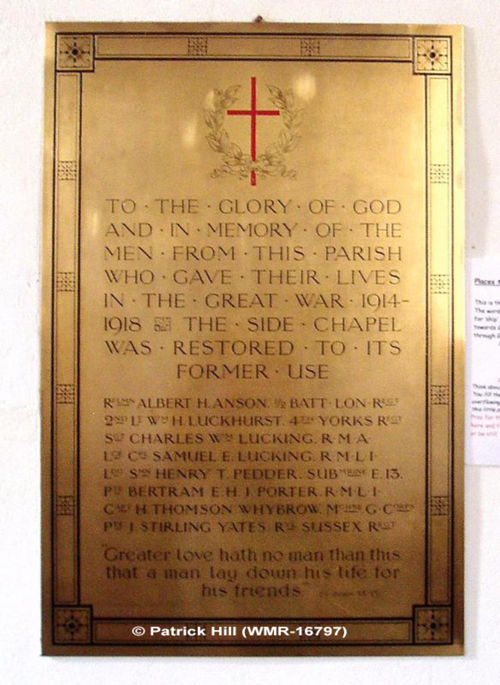 To the Glory of God and in memory of the men from this parish who gave their lives in the Great War 1914-1918 the side Chapel was restored to its former use. Includes: Sgt Charles Wm Lucking, RMA; Lce Cpl Samuel E Lucking, RMLI; Pte Bertram E H J Porter, RMLI.