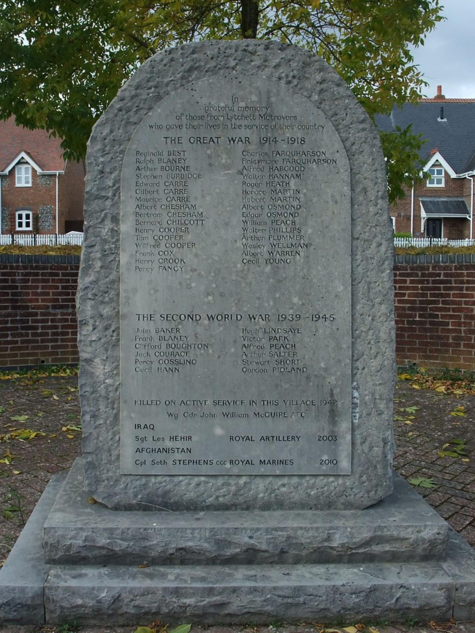 In grateful memory of those from Lychett Matravers who gave their lives in the service of their country The Great War 1914-1918: RMs; Henry Cooper; Albert Osmond; William Peach; The Second World War 1939-1945: RM; Percy John Gosling; Killed on Active Service in this Village 1942; Iraq 2003; Afganistan 2010: RM; Cpl Seth Stephens, CGC.