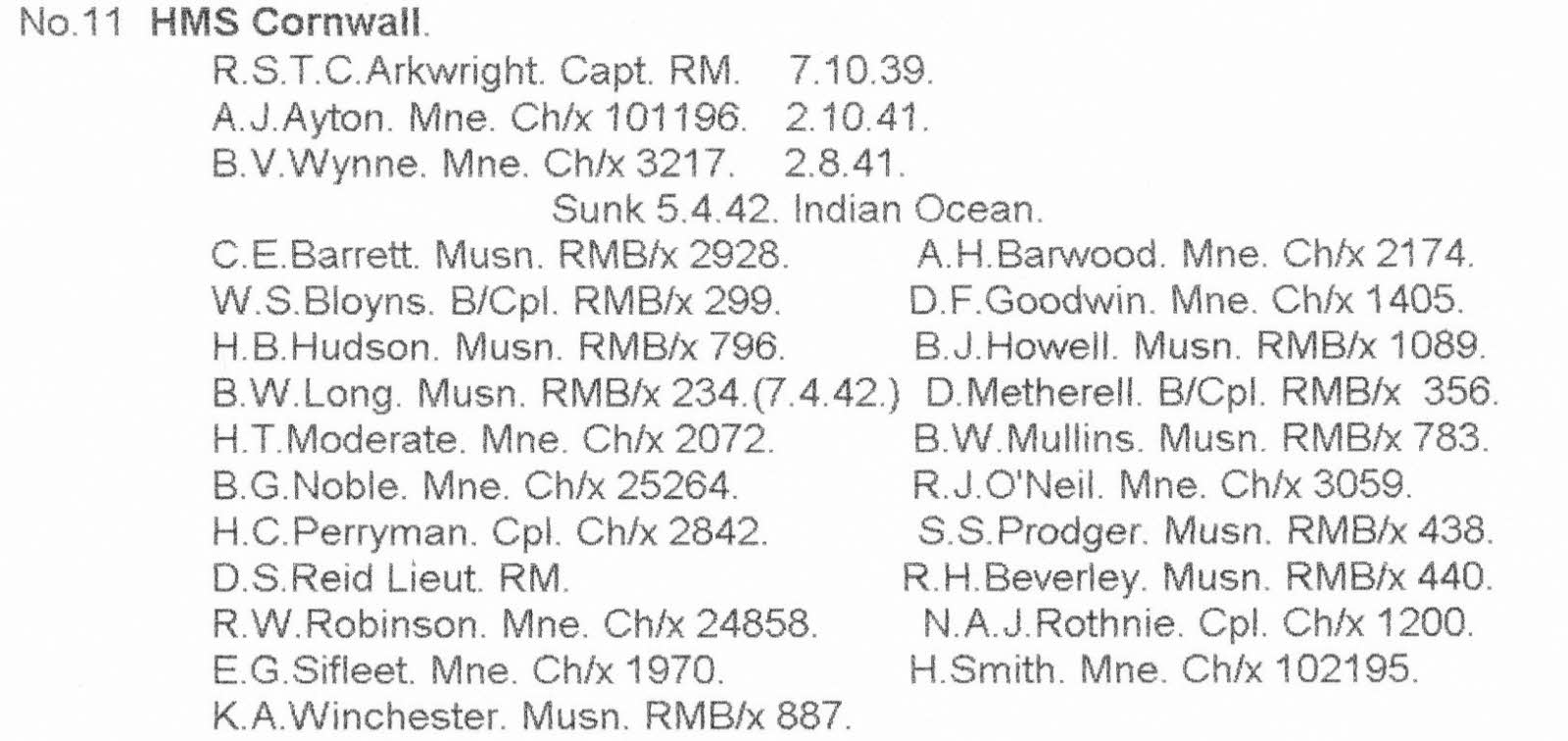 Refer entry for St. Georges Church - ( Nore Memorial Windows - in the Chancel ) windows in St. Georges in memory of ships and actions do not list those who died. See image section below for HMS Cornwall Royal Marines list.