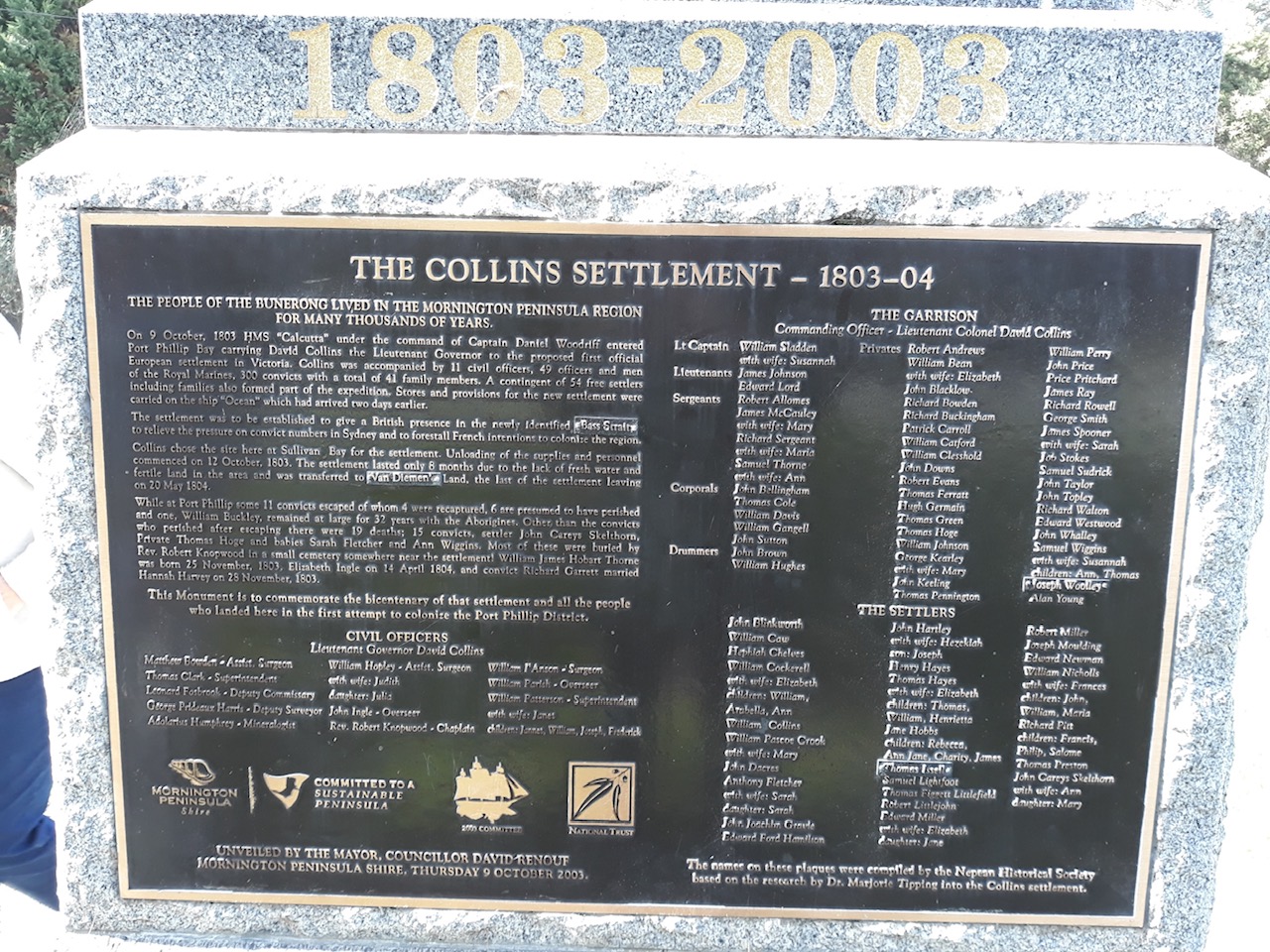 Memorial from 1803 from the attempted settlement at Sullivans Bay, Sorrento, Victoria by Collins.