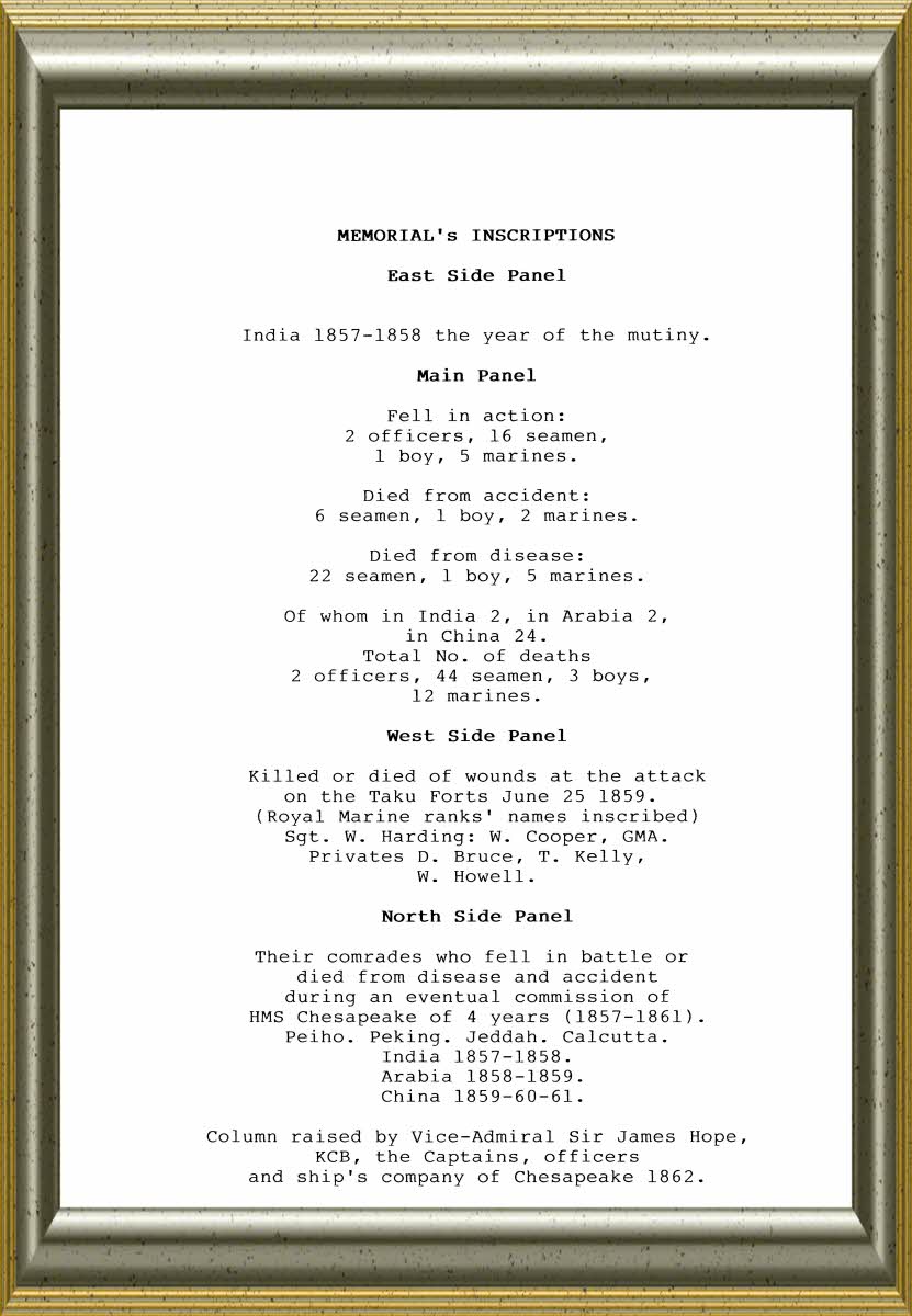 Memorial in honour of the Officers and Men who died during the ship's four years commission 1857-1861. Located on The Eplanade ( near HMS Victorys anchor ) Southsea, Hampshire.