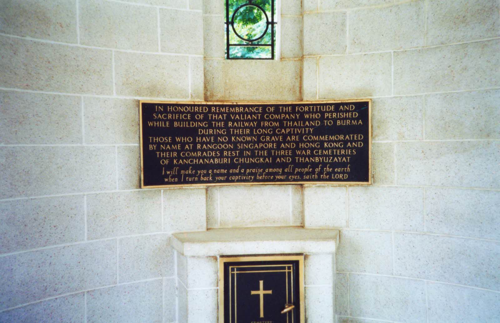 Memorial at Kanchanaburi War Cemetery, Thailand. Inscription: I will make you a name and a praise among all people of the earth when I turn back your captivity before your eyes saith the Lord.