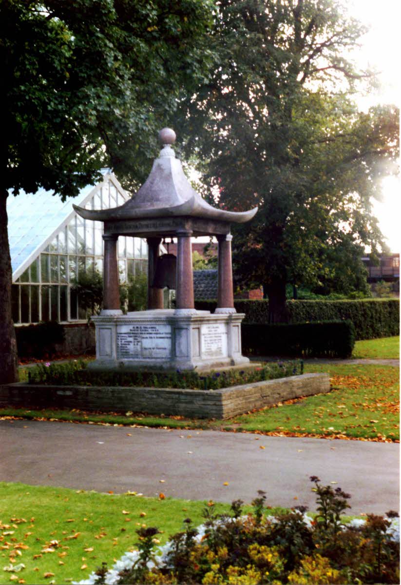 Memorial located Victoria Park, Portsmouth, Hampshire. Inscription: This bell was taken at the capture of the North West Fort Taku, June 17th 1900, and brought home by HMS 'Orlando'. The memorial is erected by the officers and men in memory of their comrades who lost their lives during the commission.