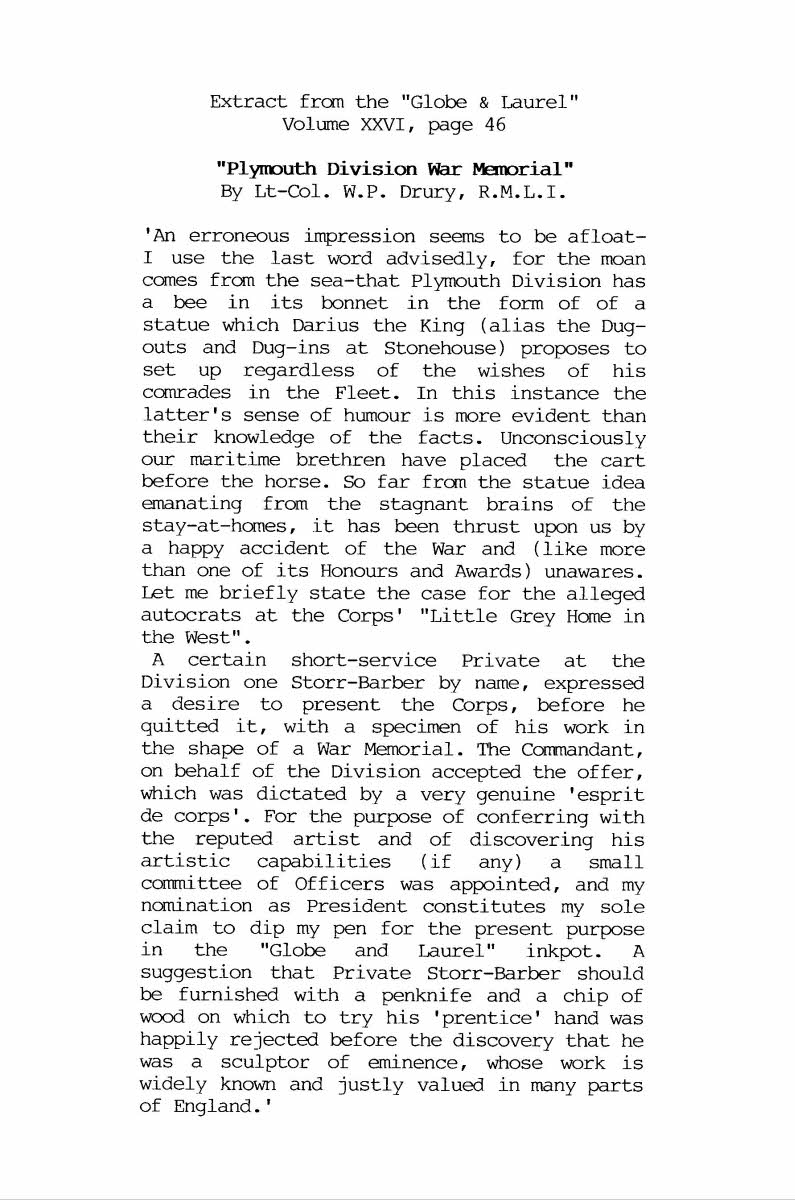 Memorial located on Plymouth Hoe, Devon. It is a bronze figure of St. George flanked by two Royal Marine figures. The Memorial was unveiled 8 November, 1921, by Earl Fortescue, Lord Lieutenant of Devon. ( See image for extract from Globe & Laurel ).