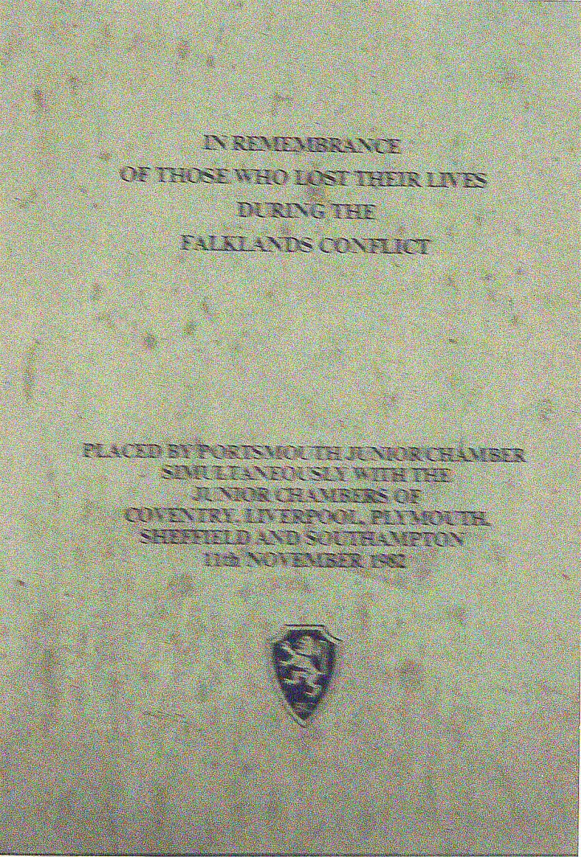 Memorial is a small granite plaque in a wooden frame standing at ground level in front grounds of Portsmouth Cathedral, Old Portsmouth, Hampshire