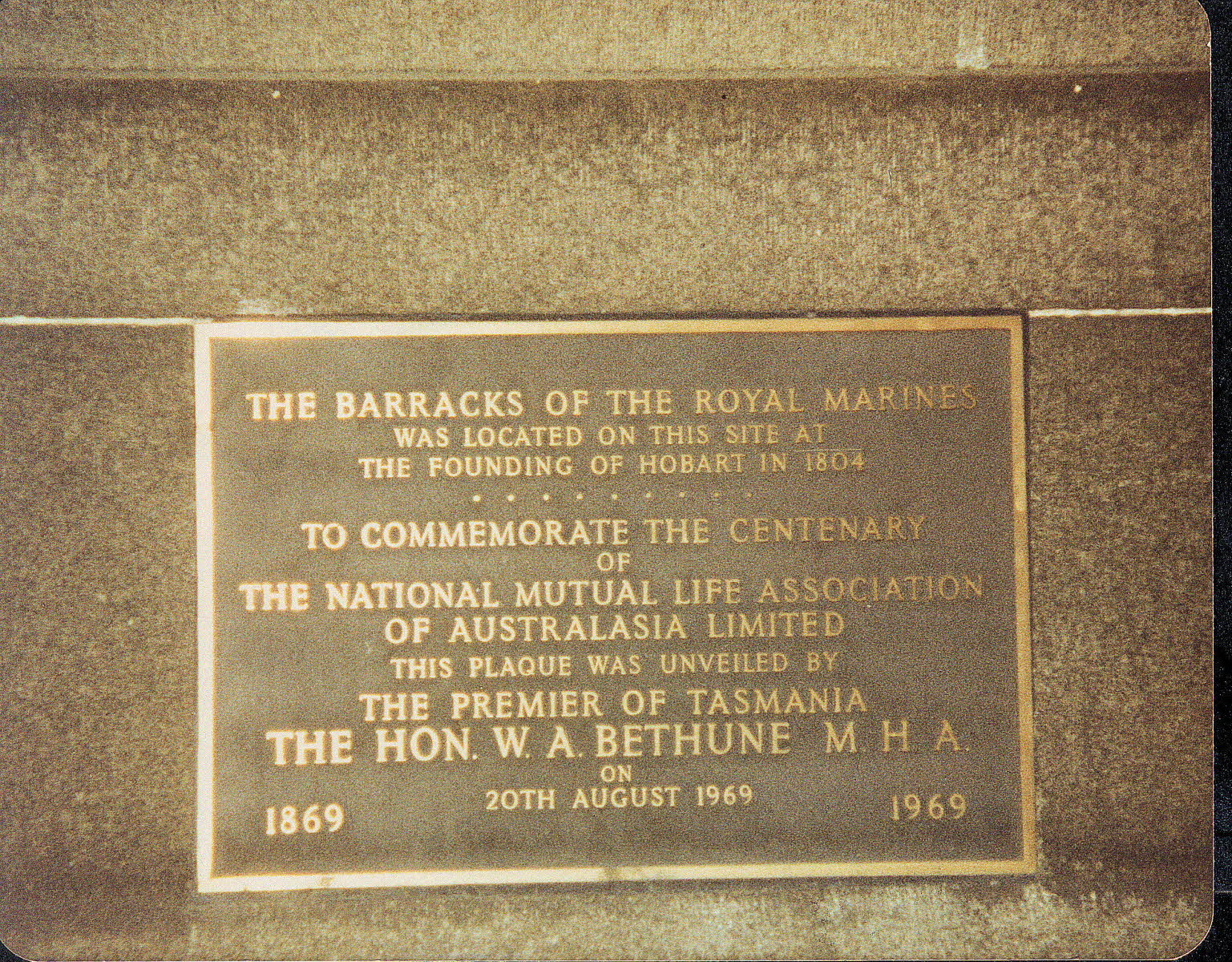 Plaque commemorating location of Barracks of Royal Marines at the founding of Hobart, Tasmania, 1869.