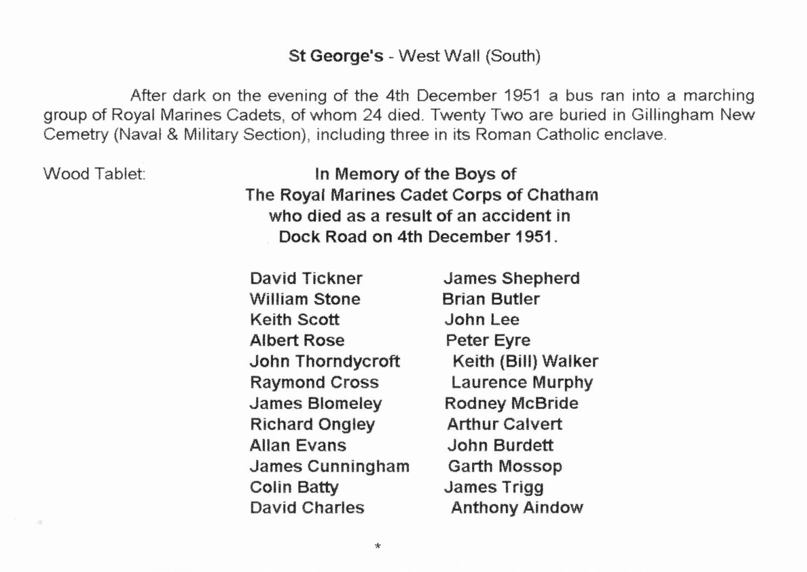 After dark on the evening of 4 December, 1951, a bus ran into a marching group of Royal Marines Cadets, of whom 24 died. 22 are buried in Gillingham New Cemetery ( Naval & Military Section ), including 3 in its Roman Catholic enclave. Inscription: In memory of the Boys of the Royal Marines Cadet Corps of Chatham who died as a result of an accident in Dock Road on 4 December, 1951. ( Plaque in St. Georges Church West Wall ( South ).