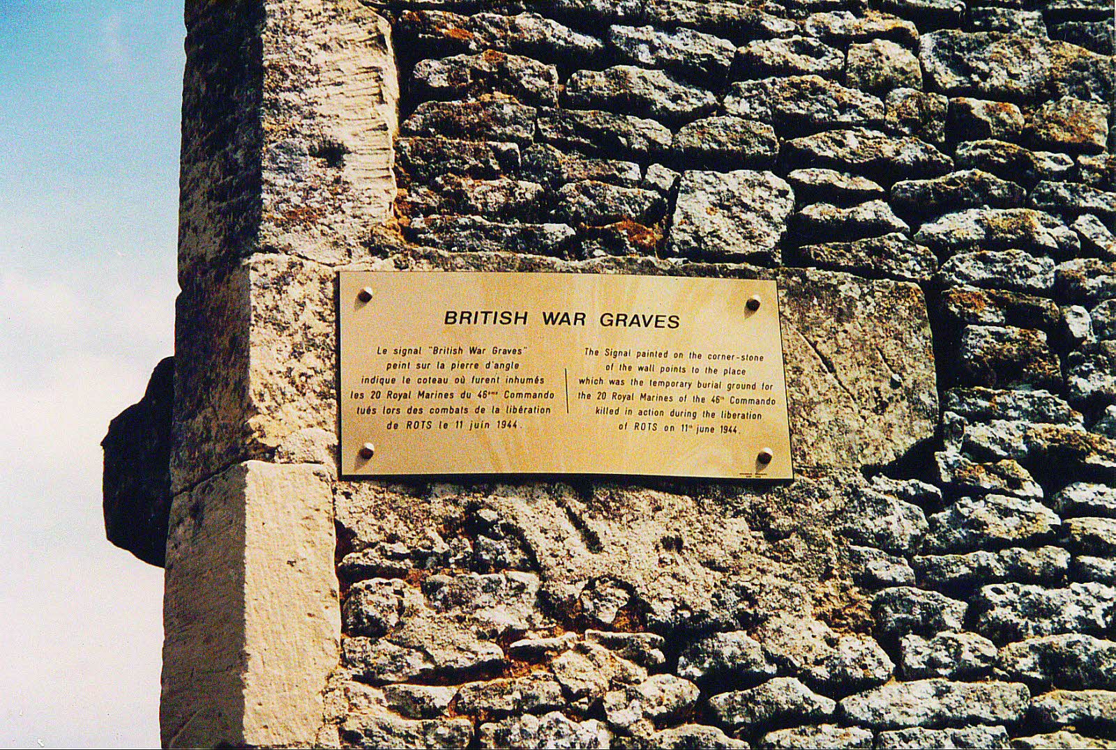 The Memorial was unveiled on 11 June, 1994 Inscription: British War Graves - The sign on the corner-stone of the wall points to the place which was the temporary burial ground for the 20 Royal Marines of the 46th Commando killed in action during the liberation of Rots on 11th June, 1944