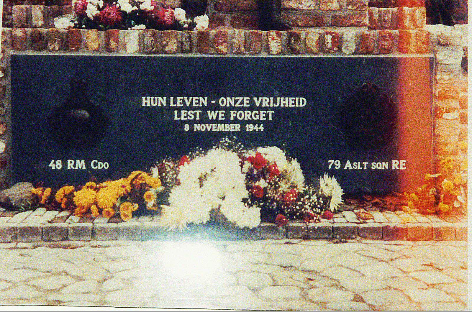 A memorial, located Serooskerke Village, Island of Walcheren, Netherlands, to the ranks of 48 Commando RM and 79 Squadron Royal Engineers who lost their lives when the Landing Vehicles Track were hit by enemy fire. Inscription: ( Led by Jacob van Winkelen, an honorary member of 48 Commando RM Association, the people of Serooskerke raised the money and erected the monument ).