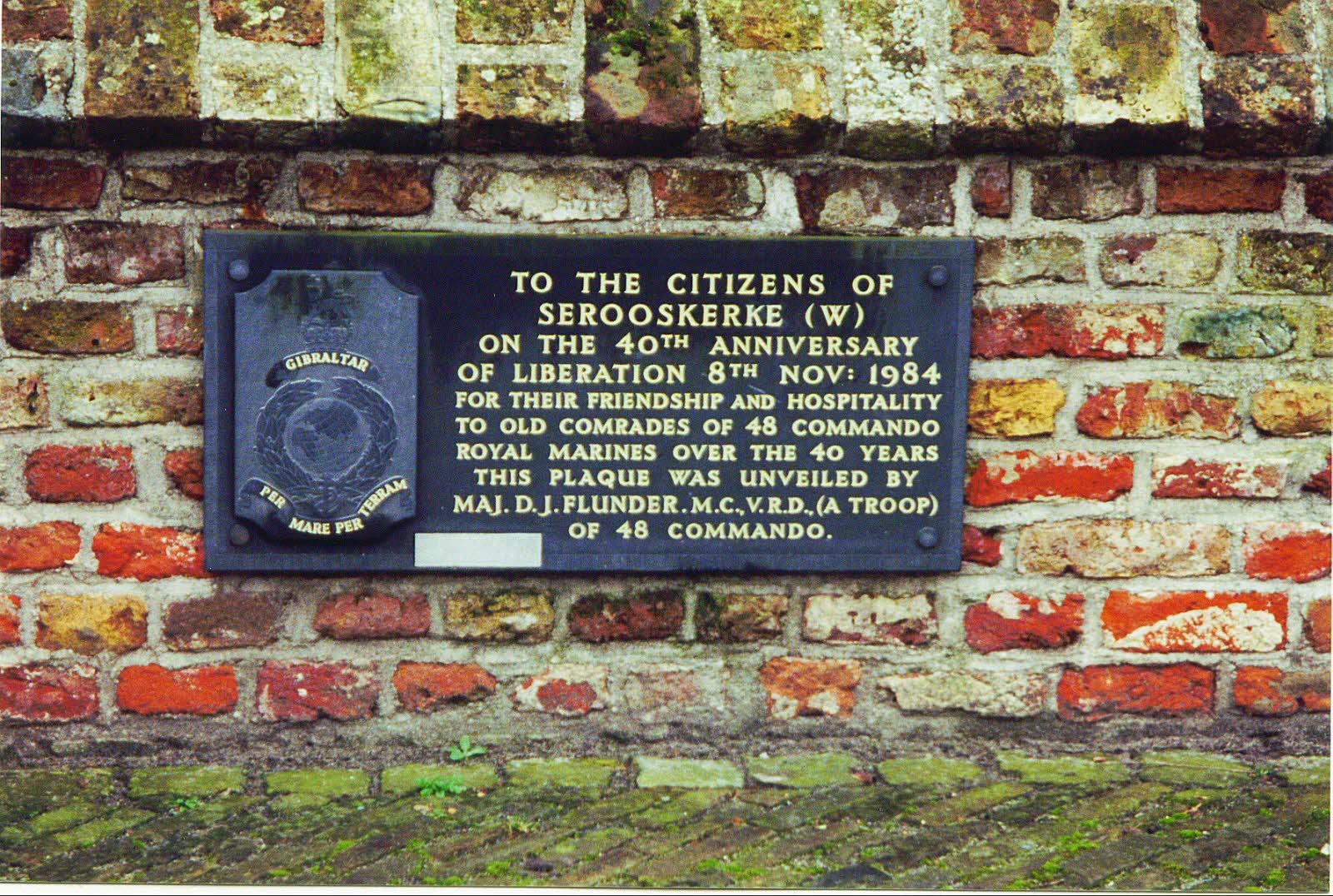 A memorial, located Serooskerke Village, Island of Walcheren, Netherlands, to the ranks of 48 Commando RM and 79 Squadron Royal Engineers who lost their lives when the Landing Vehicles Track were hit by enemy fire. Inscription: ( Led by Jacob van Winkelen, an honorary member of 48 Commando RM Association, the people of Serooskerke raised the money and erected the monument ).