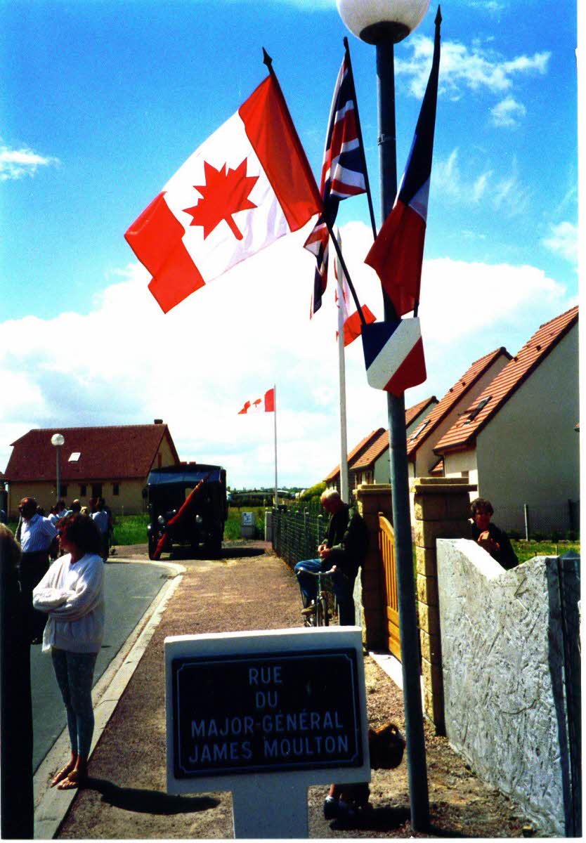 The Plaque was erected when the road was renamed in 1994 during the 50th Anniversary of D-Day ceremonies. Inscription: Rue du Major General James Moulton. ( Major General Moulton commanded, as Lt. Colonel, 48 Commando RM during the D-Day Landings on the left flank of Juno. He was wounded by mortar fragments but continued to assemble his men before they advanced inland ).