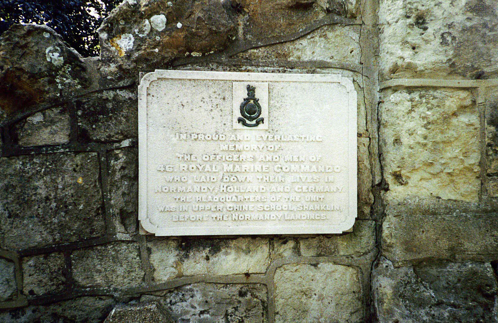 Upper Chine School, Shanklin, Isle of Wight Inscription: In proud and everlasting memory of the Officers and Men of 46 RM Commando who laid down their lives in Normandy, Holland, and Germany. The H.Q. of the unit was in Upper Chine School, Shanklin, before the Normandy landings.